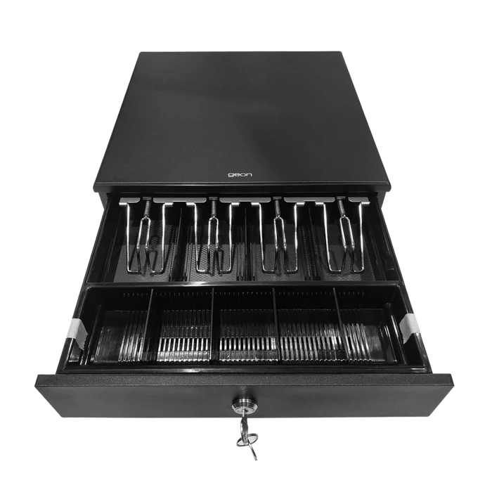 Cajón portamonedas automático Geon Cash con cuatro compartimientos para billetes y cuatro para monedas.