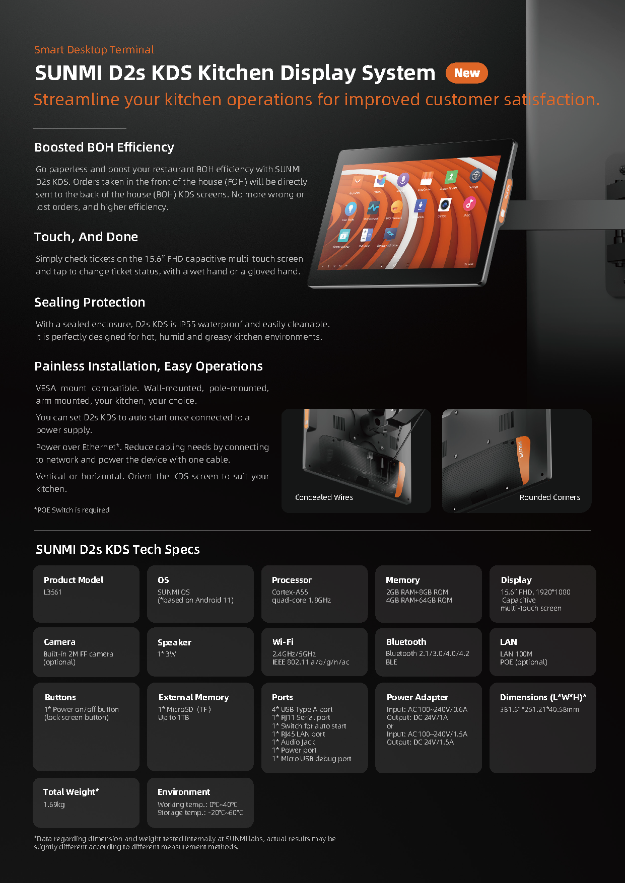 Compatible con montaje VESA. Se puede montar en la pared, en un poste, en un brazo, en su cocina, a su elección.Puede configurar D2s KDS para que se inicie automáticamente una vez conectado a una fuente de alimentación.Power over Ethernet*. Reduzca las necesidades de cableado conectándose a la red y alimentando el dispositivo con un solo cable.Vertical u horizontal. Oriente la pantalla del KDS para adaptarla a su cocina.